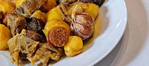 Sofrit pagès:definitivamente el rey de la gastronomía ibicenca. Es una combinación de carne, salchichas de Ibiza (como la sobrasada o butifarra) y papas, lo que lo convierte en un plato muy completo y pesado, seguido de una larga charla en la mesa y un licor de hierbas.